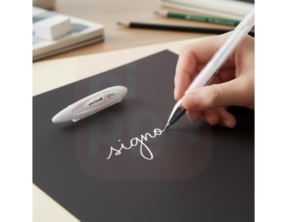 A Caneta Signo Gel Angelic Colour Branca – Uni-Ball é perfeita para quem busca traços precisos, acabamento elegante e alta cobertura. Com tinta branca intensa e pigmentação superior, ela escreve suavemente sobre papéis escuros, coloridos e pretos, realçando cada detalhe com um toque artístico e sofisticado. Seu corpo ergonômico oferece conforto ao escrever, enquanto a tecnologia japonesa Uni-Ball garante fluxo de tinta constante e duradouro. Ideal para artesanato, lettering, bullet journal, convites e ilustrações, a Signo Gel Angelic Colour transforma qualquer escrita em arte.